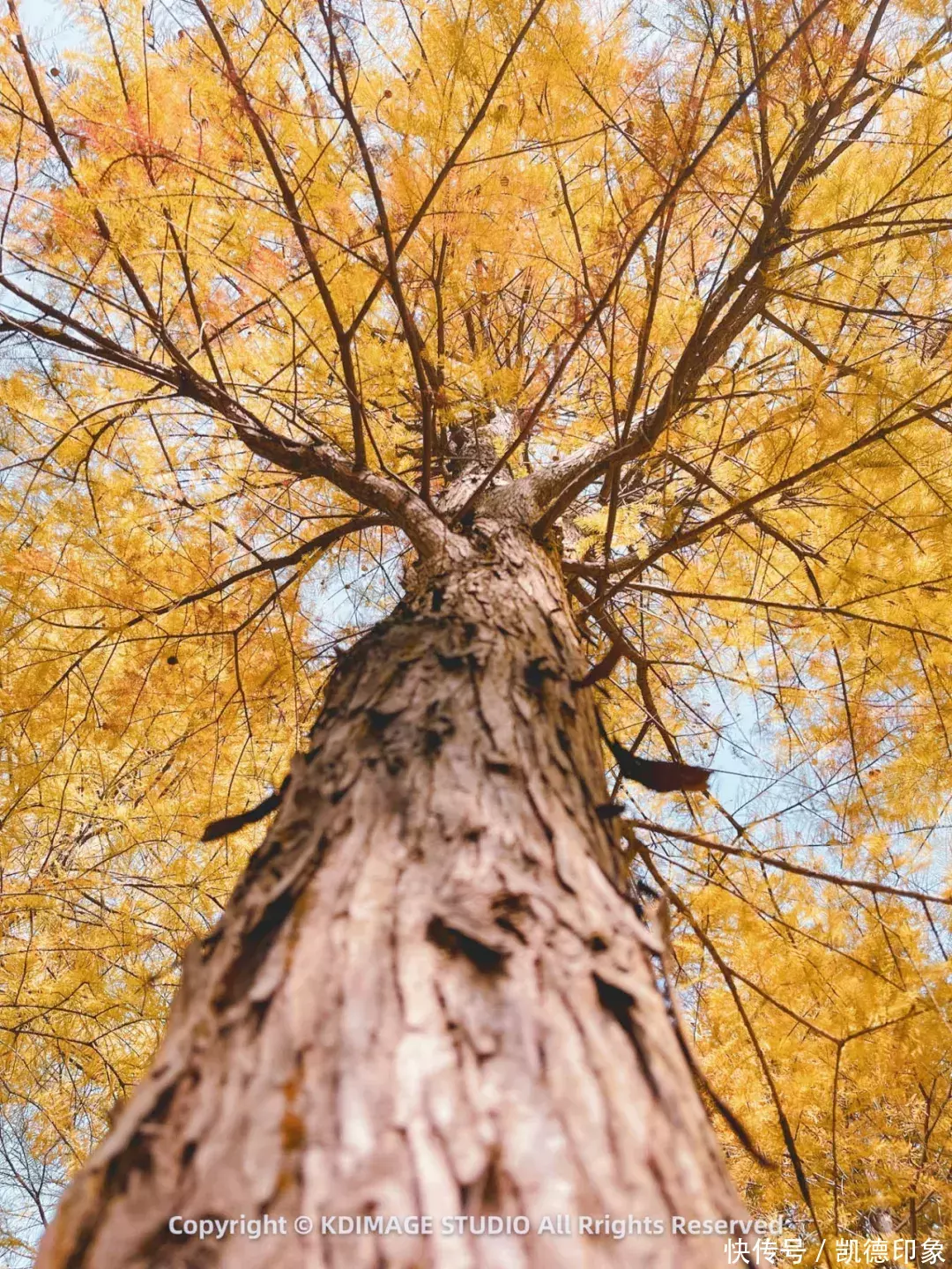 构图技巧:运用三分法、对角线等构图方法,使画面更加平衡、美观。放低手机或相机,仰拍落羽杉。利用水面的反射拍摄落羽杉,创造对称美。
